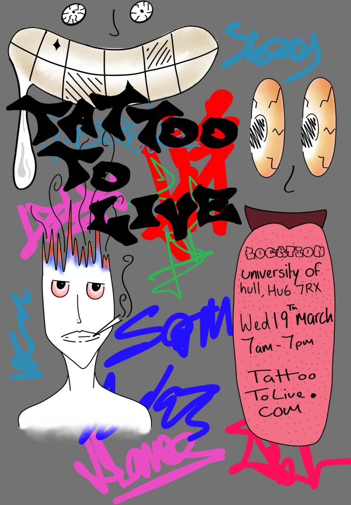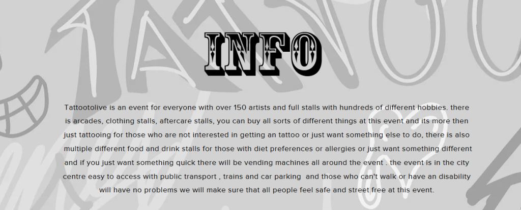 The entertainment what is at this event is live entertainment (small local music bands) , there will also be clothing stalls who like to shop , aftercare stalls for tattoos, an arcade , makeup stalls , jewellery stalls , homemade goods and multiple different types of food and drinks for those with diet preferences because of how I’ve described the event the users will be interested to see what its like and it will bring more attention to the event also with the poster being put out in public will catch peoples eyes to read into the event more and to find out the many different styles of tattoo artists that will be held at this event with its massive range of entertainment and hobbies
