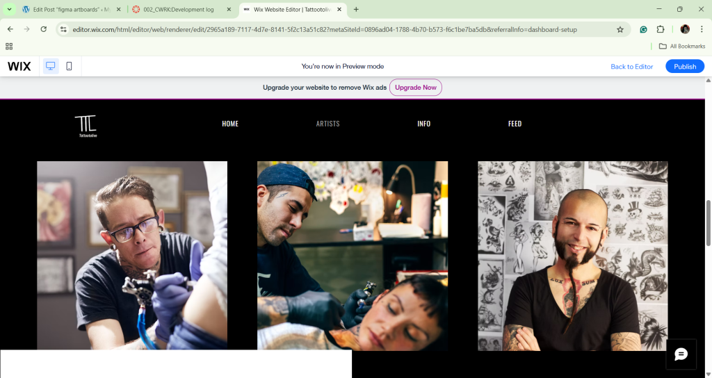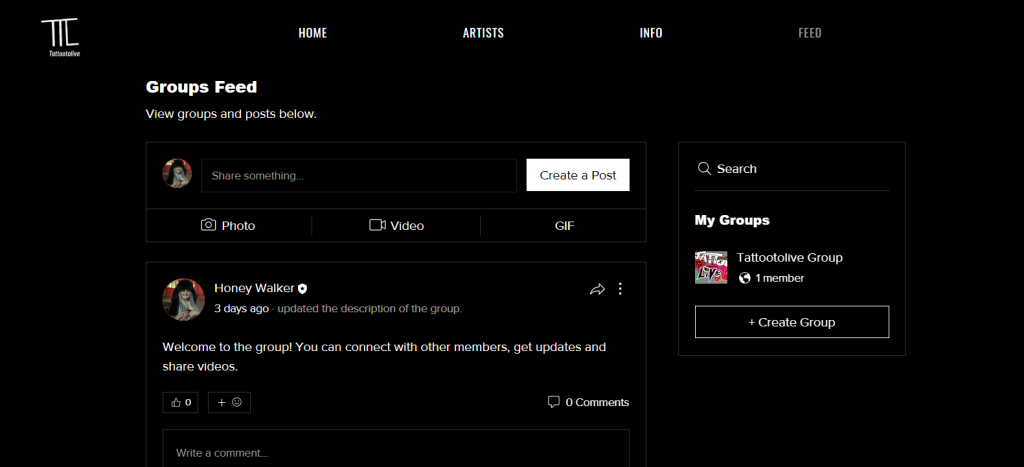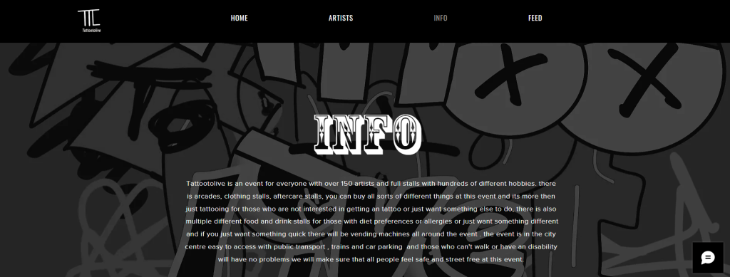 this time I added small effects and changes out through the whole website one of the first changes I had changed the groups page into feed page this is where all different kinds of companies , artists and even people with the same interests can go on this is to help people find others with the same interests and to see what work , food , hobbies and more will be at this event or you can ask people about past experiences with tattoo conventions to see if you think you will enjoy it can be used for a bit of everything to be honest, you can even do this like show off what merch or such you got at the event . when entered the website I had added an effect where the page bar expends to give an calming yet cool effect to the page also when you press on the page it goes from white to Gray to show what page your about to go on this is a similar effect with the buttons on the page too when pressed they go from white to black and this is to make sure you know what your about to go on . I also made the logo on a logo part of the wix site where you can create logos, and I found that as a really helpful tool and will use again and I also made my own form for companies to sign for space at the event.