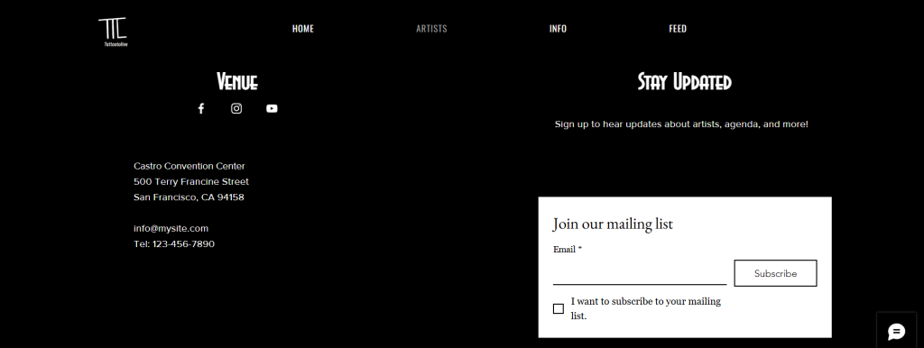 before this information was put on the home page under the poster but I felt like this made the home page look messy and unorganised and I think it makes more sense to put it on the artists page so when people are curious they will find that under it and make them more interested about the event there is also an effect put on this page where the artists fade into being shown, also at the bottom of all these pages there is an mailing list sign up for those who want updates on the event and such also an live location and tells you the location of where the venue is located with written out post code and street name with number and this is on every page