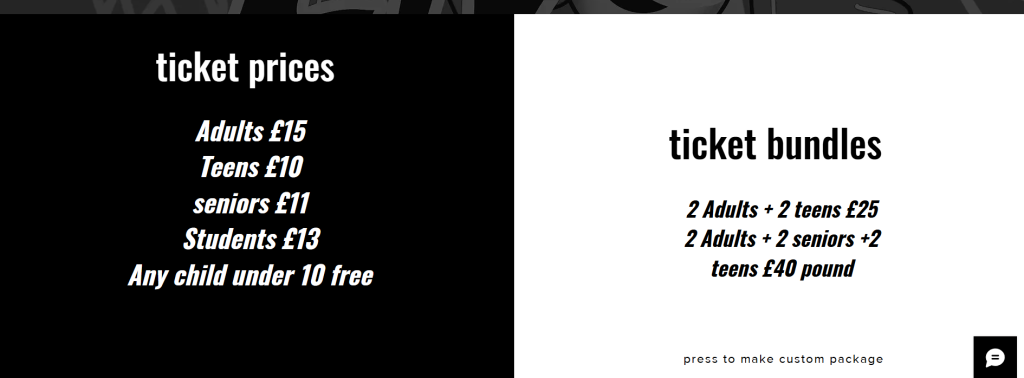 On this page I have added a few small things to improve the page because before it was just an description of what is at the event and such to make people interested and now I have added a ticket price list and bundle tickets for those who want to bring family’s to this event and under that there is a button for those who want to make custom packages for those who are coming in a large group of friends and such and I also added the new background to the info page although it may not look like much it’s a big difference to what it looked before .
