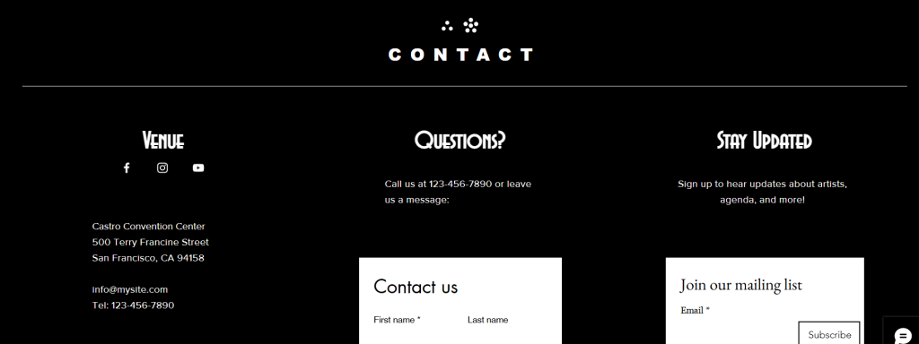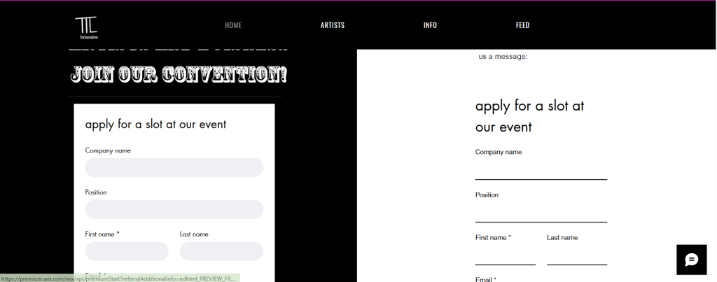 I started on the home page with how the poster was laid out and what was on the home page I started by adding two different half’s at the top of the page so people could see the full poster without having to move a lot of the screen to see the whole thing I made it next to the welcome page with the new background and the button under the brand name takes you to the info page. Under that part of the home page there is an contact form and a apply for a space at the event form this is for those who have questions about the event or want to participate and join us to work at the event there is also a phone number under the contact to call in case you prefer calling but there is also a live chat on every page on the right corner that could also be used for questions or more information about the event